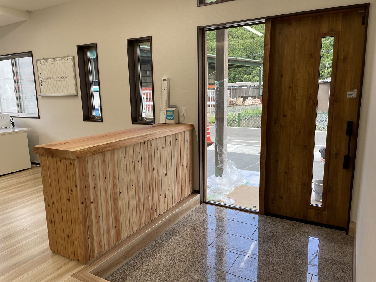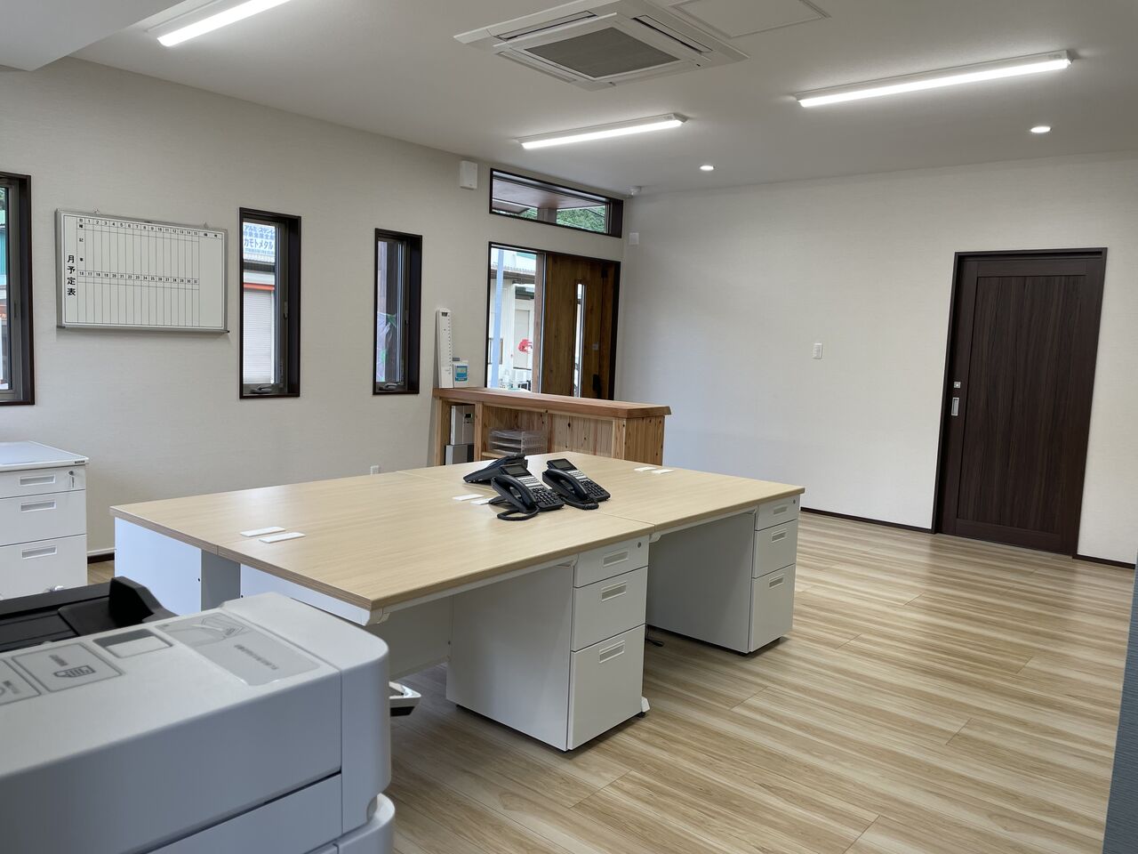 事務スペースと作業員さんの休憩・打合せスペースを間仕切り壁で分けました。