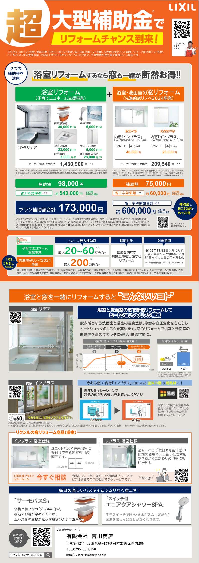 住宅省エネ2024キャンペーン~浴室リフォーム編~ 2024年01月25日 こんにちは!先日お知らせしました住宅省エネ2024キャンペーン。前回はキッチンリフォームを例に挙げていました。 今回は浴室リフォームの詳細をご覧ください◎(画像ファイルなので、PCの方はクリックで拡大して見て頂ければと思います)浴室が寒いと、冬場のお風呂が苦痛になりますよね。ひんやりとしない床材やお湯の温度が下がりにくい浴槽等の導入で、お風呂タイムを快適にしてはいかがでしょうか?内窓のリフォームも補助金対象です!外気の侵入を減らして浴室を温かく♪補助金の手続きは全て弊社で行います。この機会にぜひリフォームをご検討ください◎お問合せはお気軽にどうぞ! カテゴリなしの他の記事 タグ :#浴室リフォーム#お風呂#浴室乾燥機#窓リフォーム#住宅省エネ#補助金#有限会社吉川商店#リノベーション#多可町#西脇市 < 前の記事次の記事 > コメント コメントフォーム 名前 コメント 記事の評価 リセット リセット 顔 星 情報を記憶 コメントを投稿する
